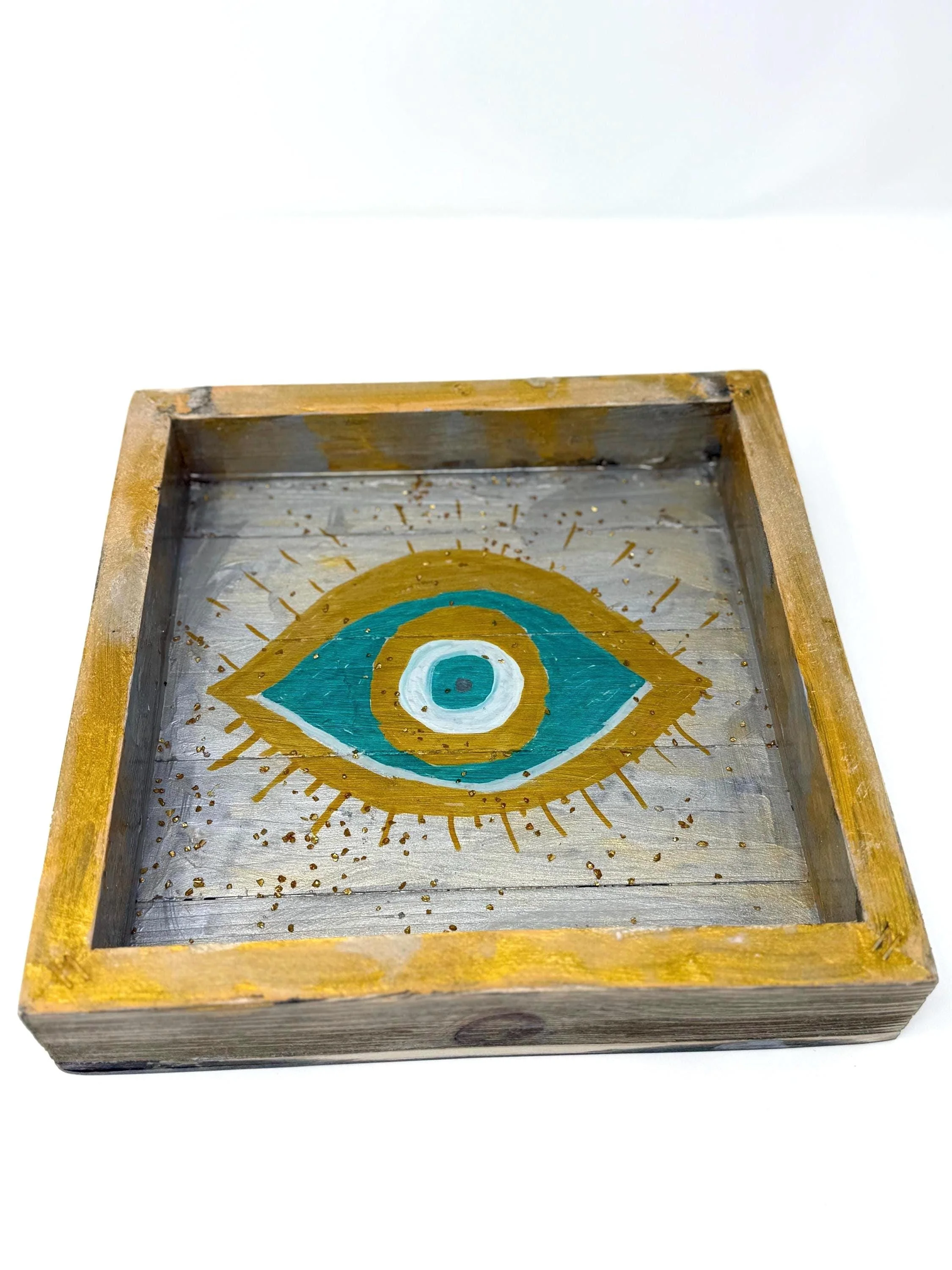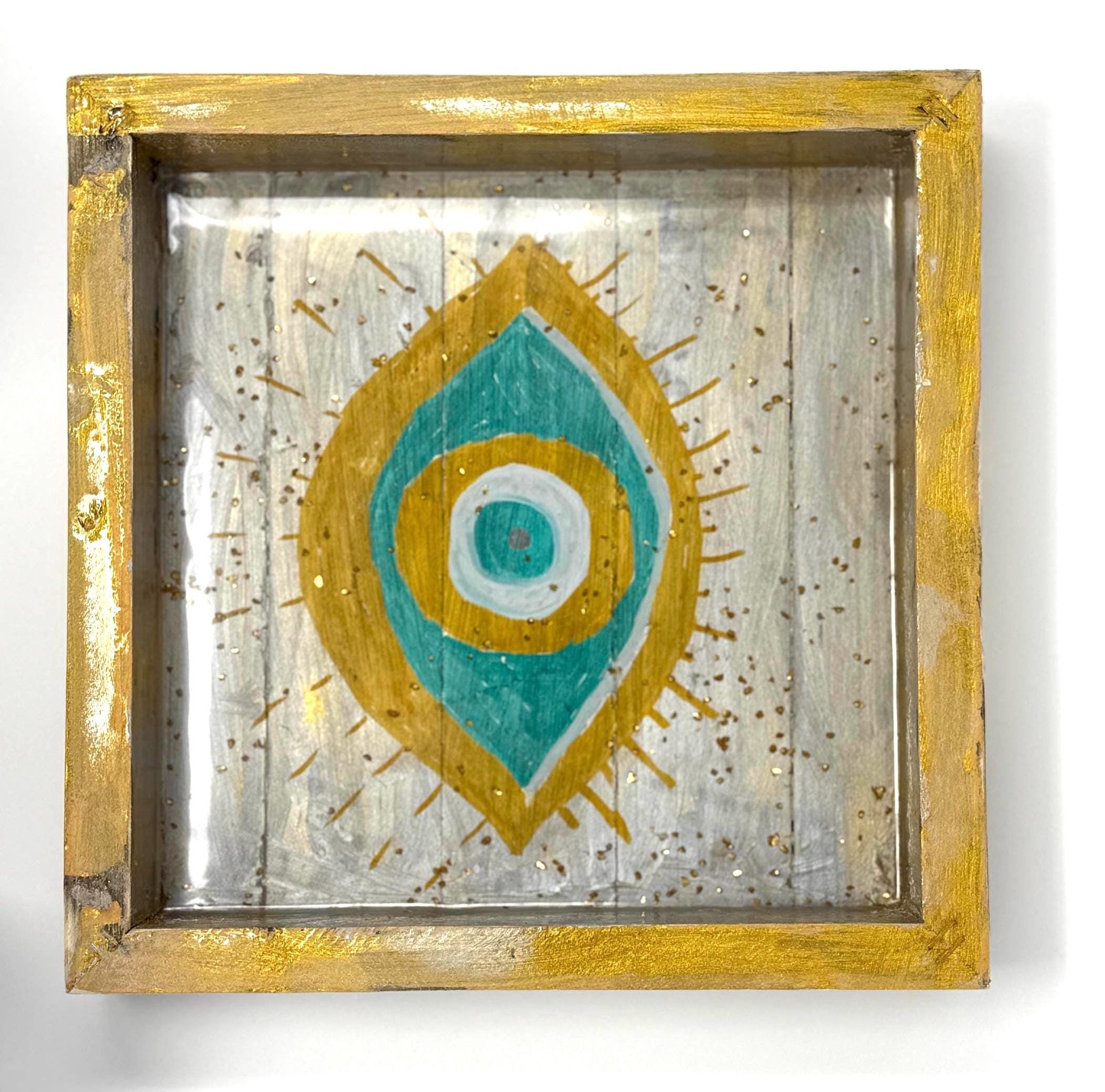 This unique piece features a hand-painted evil eye design in calming shades of turquoise, gray, and shimmering gold, set within a sleek layer of crystal-clear resin. The wooden frame adds warmth and texture, perfectly complementing the modern, mystical vibe of the artwork.