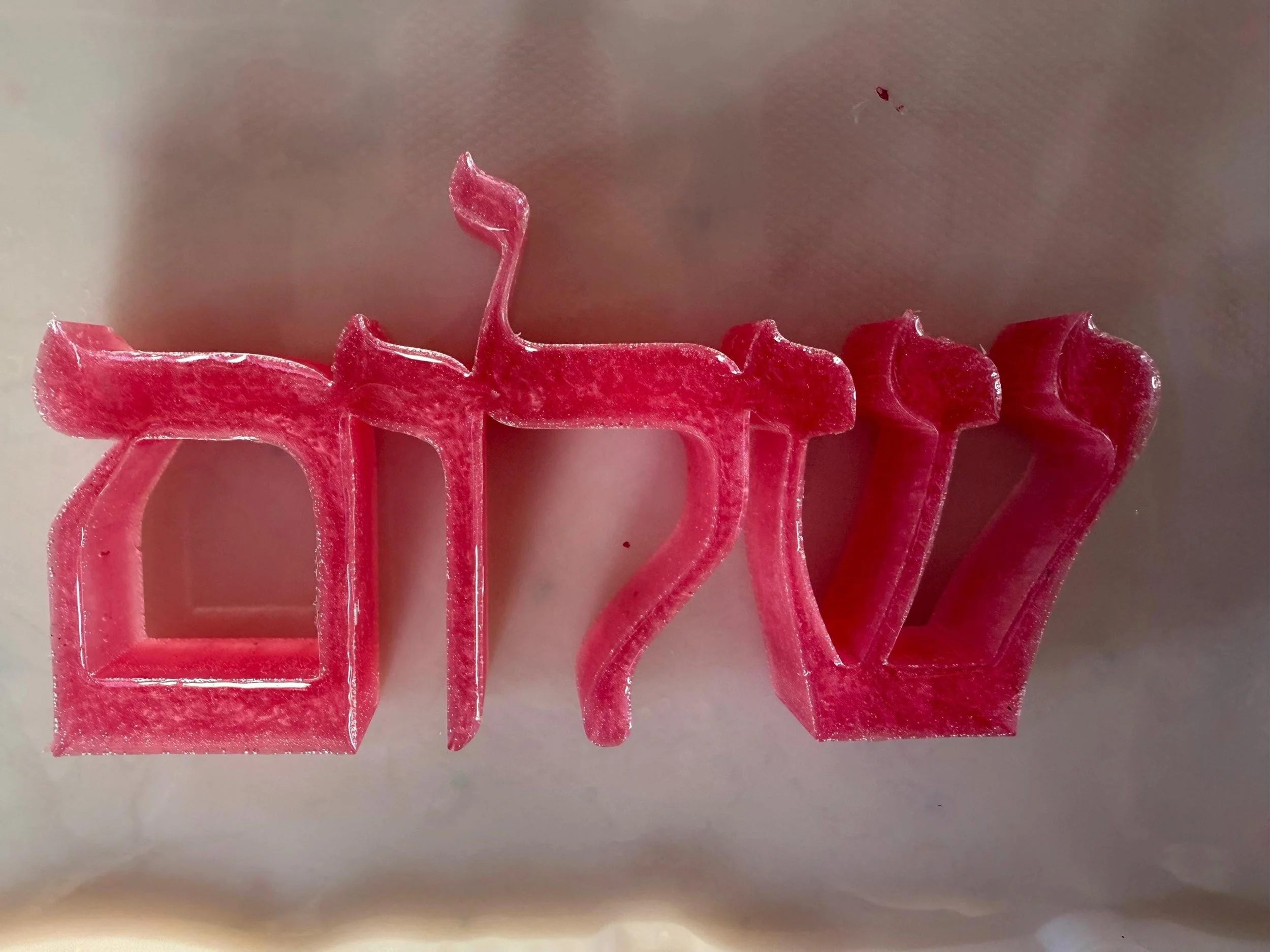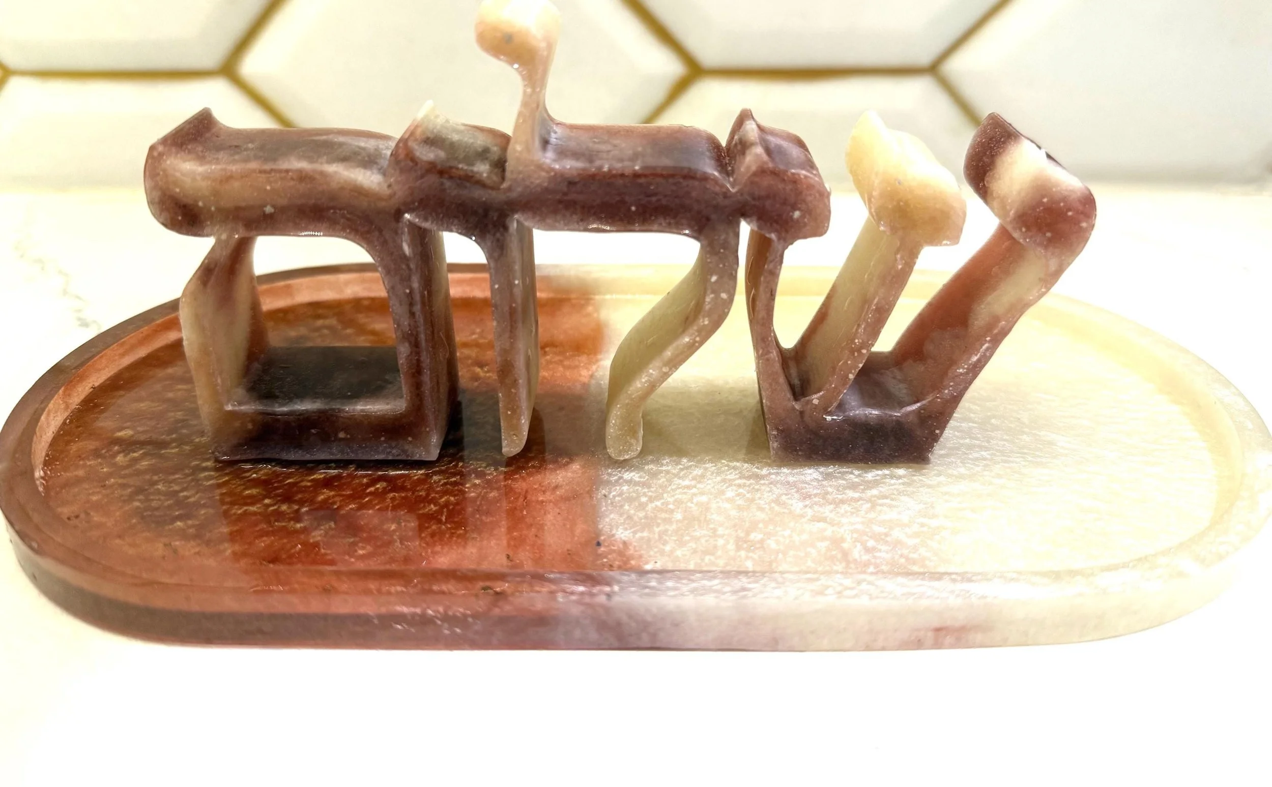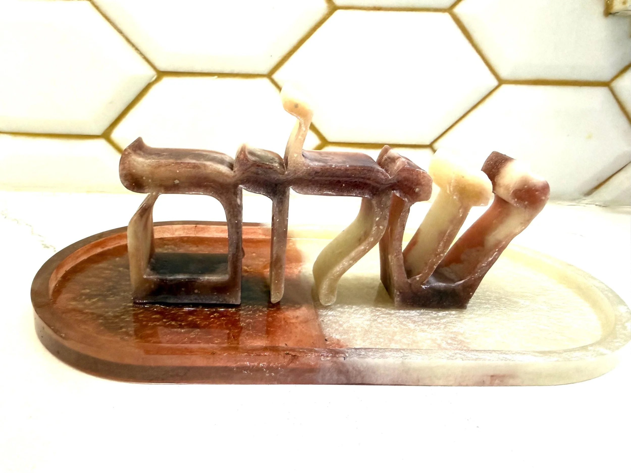 Add a meaningful and artistic touch to your home with this custom handmade resin "Shalom" sign, written in beautifully stylized Hebrew calligraphy. "Shalom" means peace, wholeness, and harmony—making this piece a perfect gift or spiritual accent for any room. Carefully crafted in any color you want, this piece can have a glossy or matte finish and sculptural texture that gives it a modern yet timeless feel. Ideal for wall décor, desk display, or gifting during Hanukkah, housewarmings, or Jewish celebrations, this unique artwork blends tradition with contemporary art. 6x3x1 inches