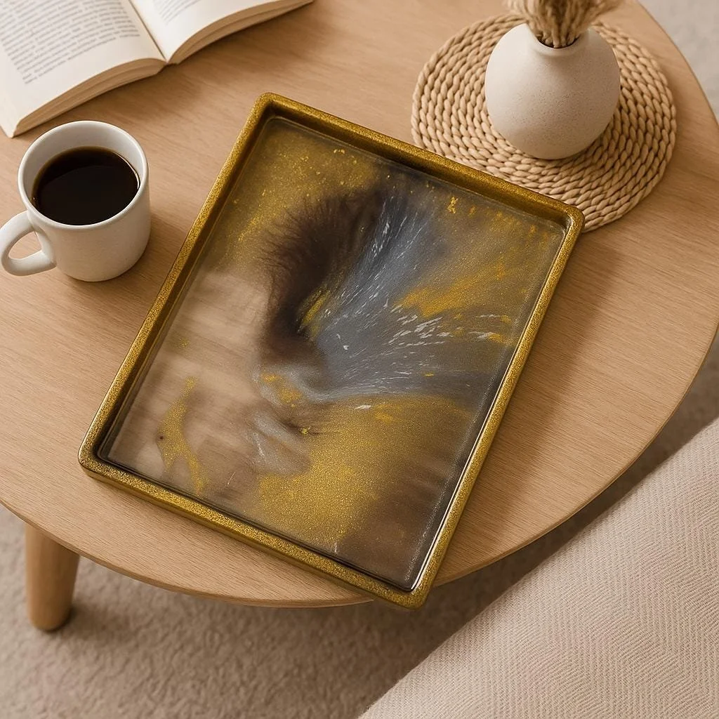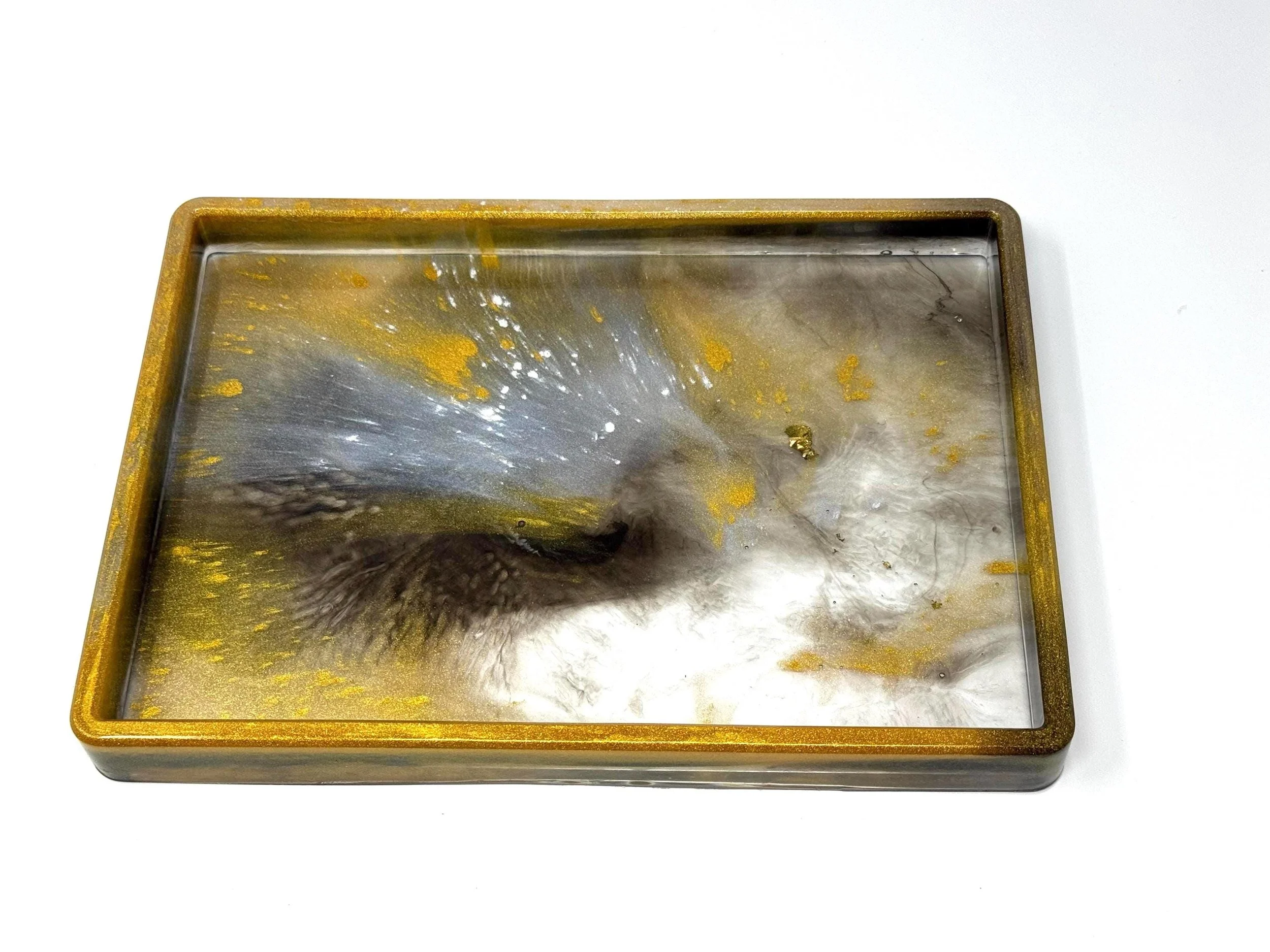 Elevate your space with this handmade resin tray, featuring a stunning blend of metallic gold, silver, gray, and white tones that effortlessly mesh together for a chic, modern look. Designed as a versatile tray, it’s perfect for displaying decor, holding jewelry, serving small treats, or using as a stylish catch-all.
