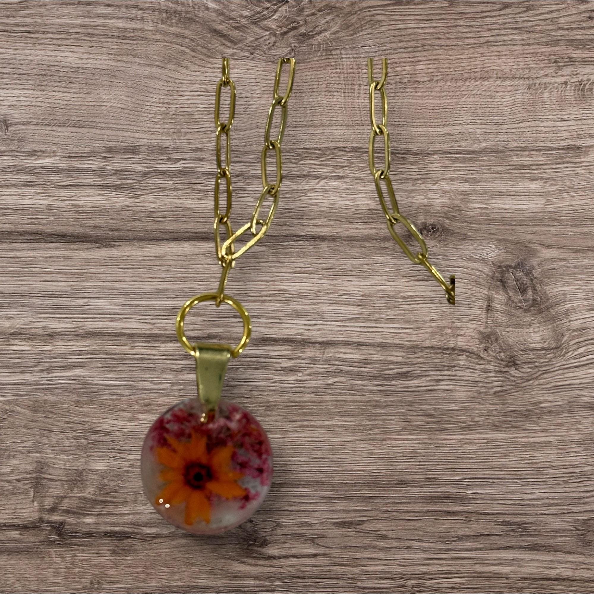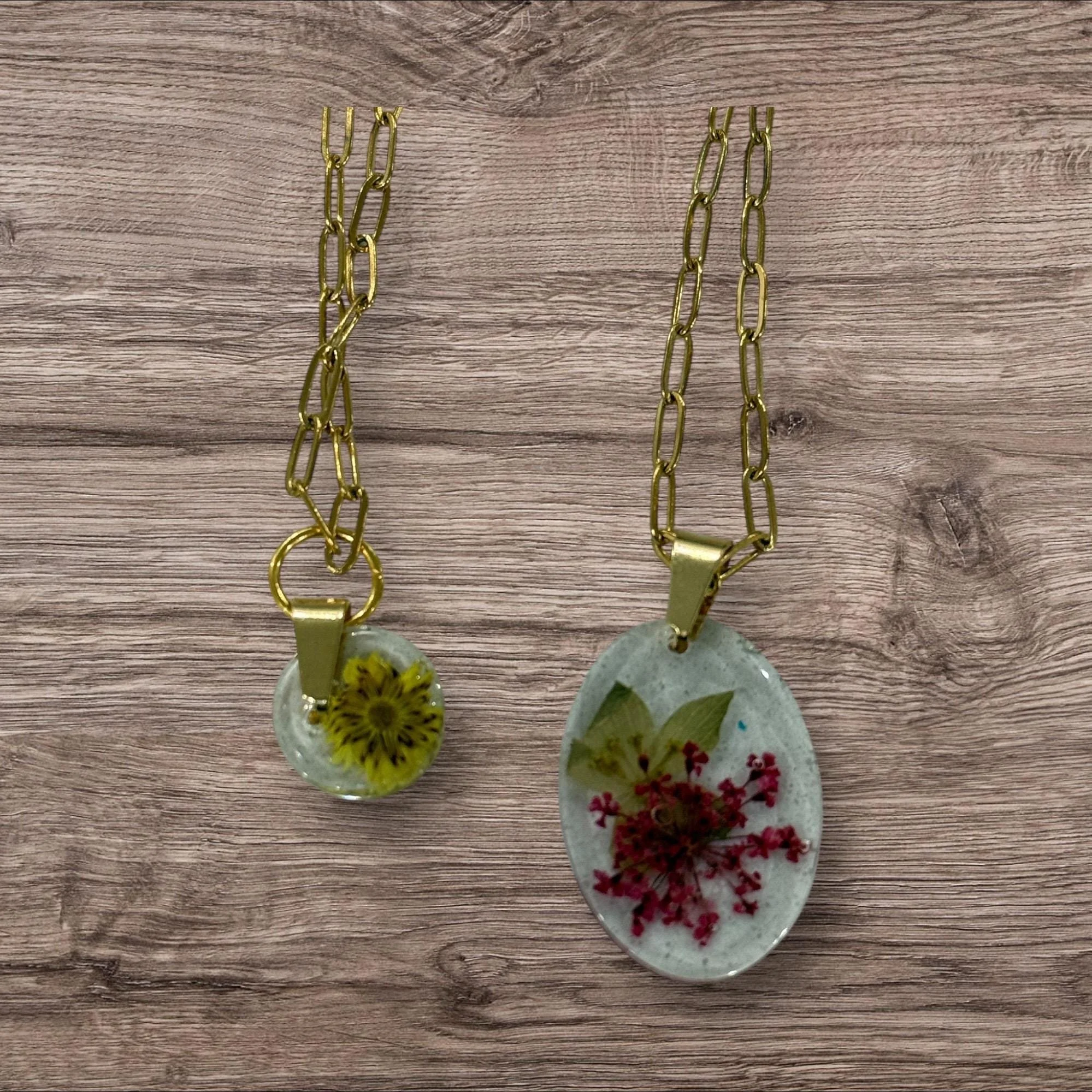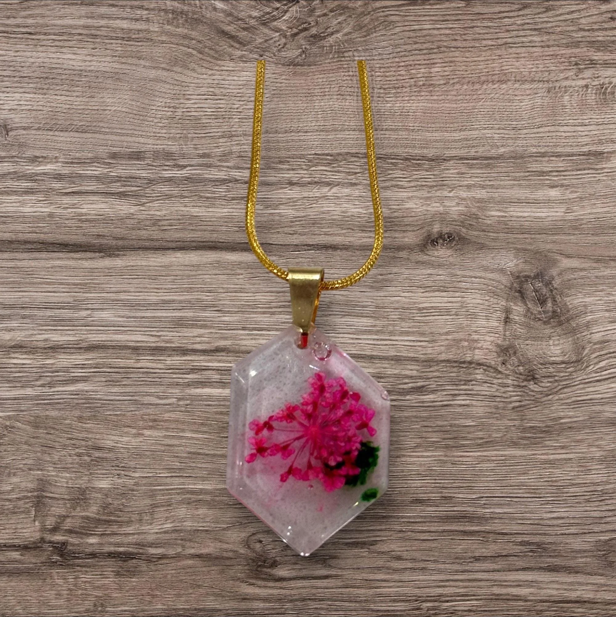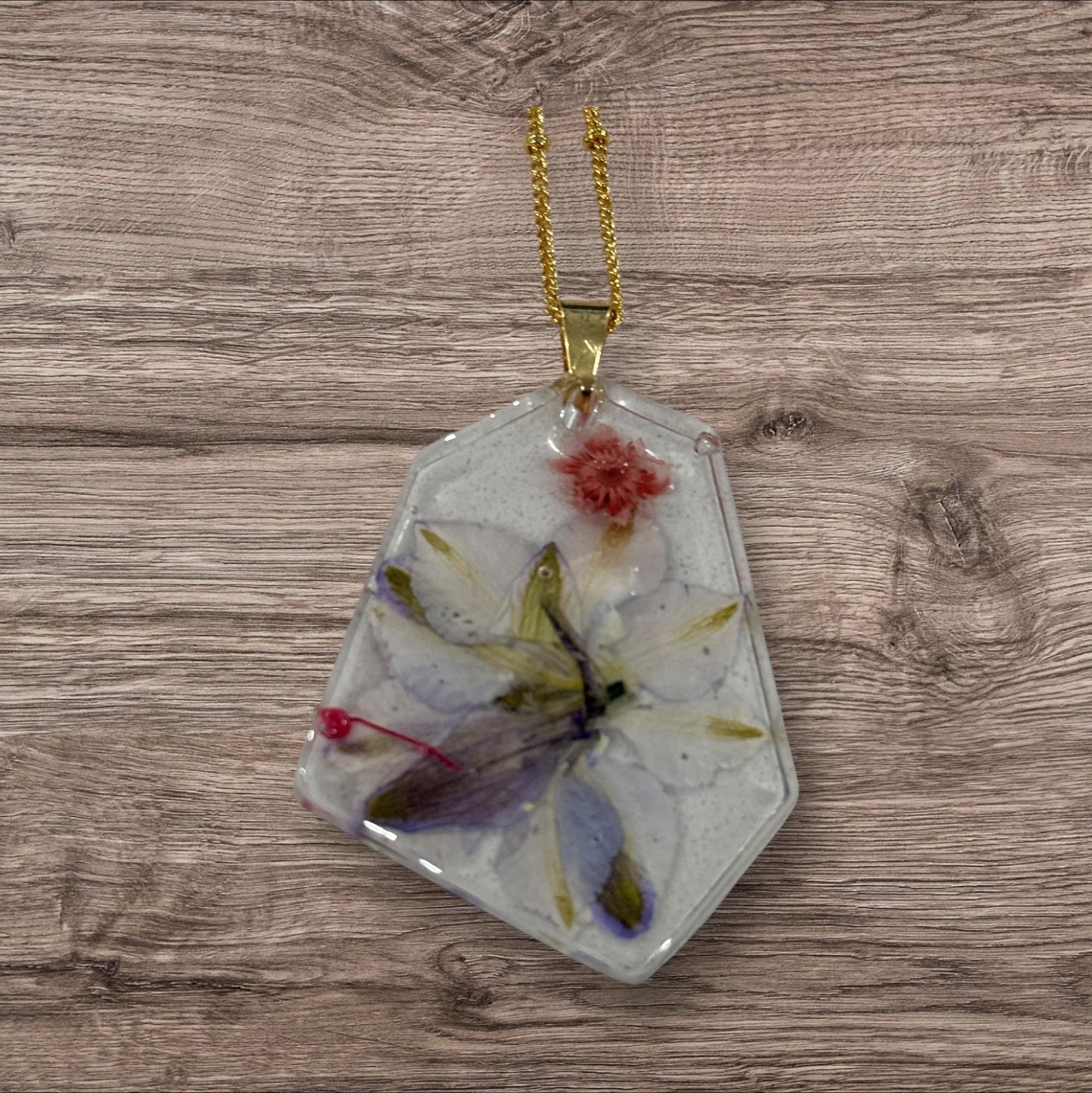 Handcrafted resin pendant with embedded real flowers