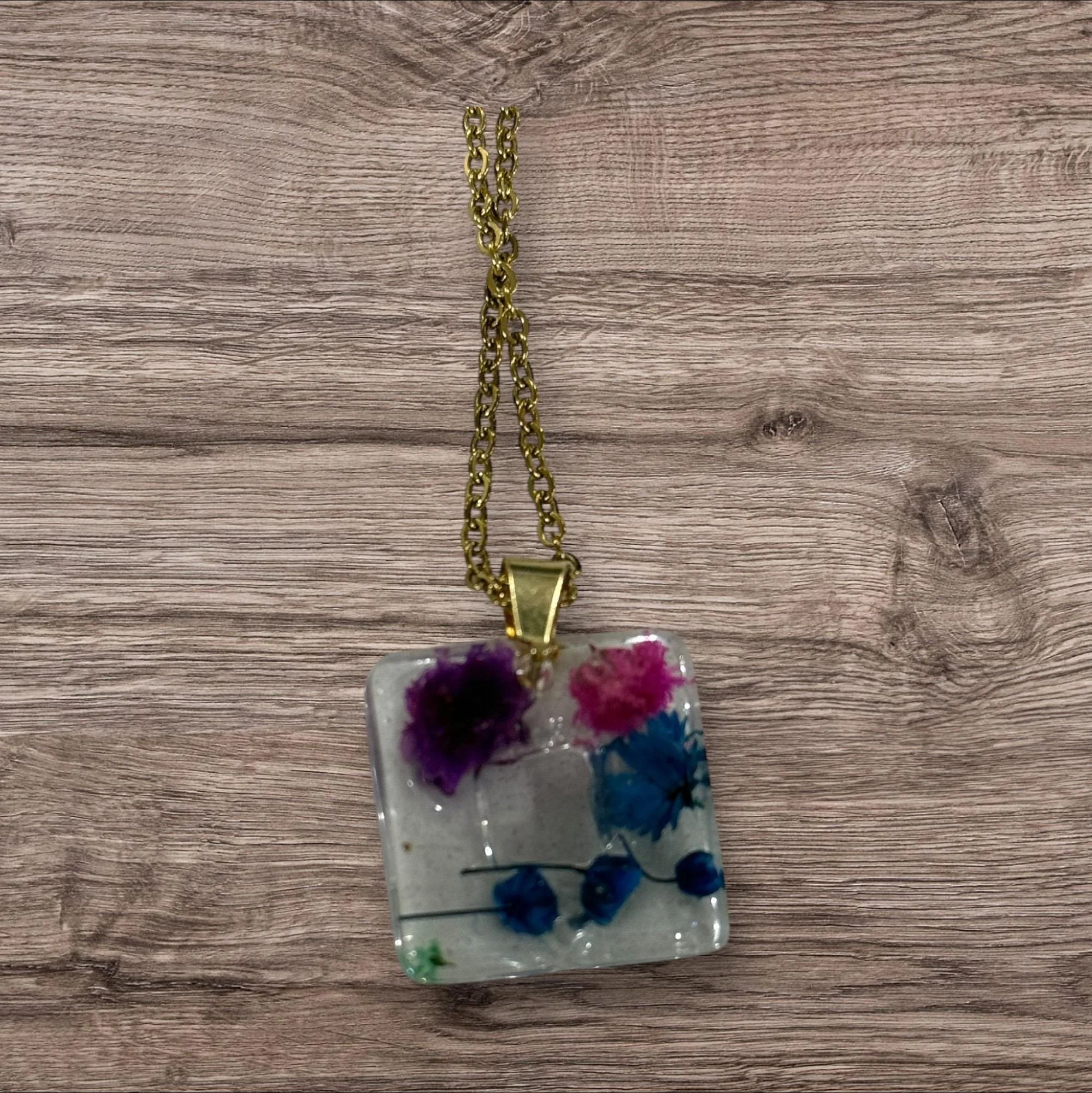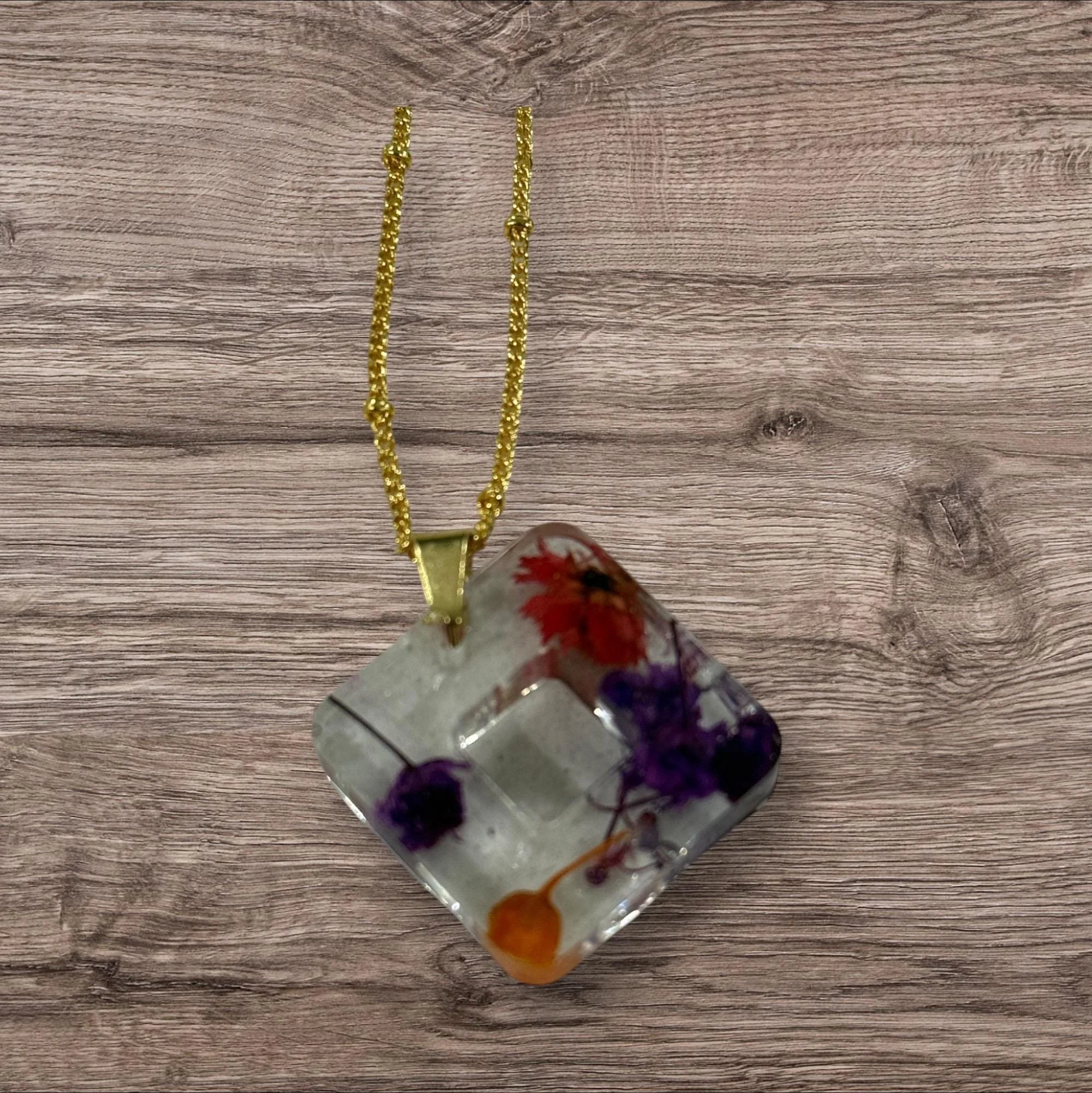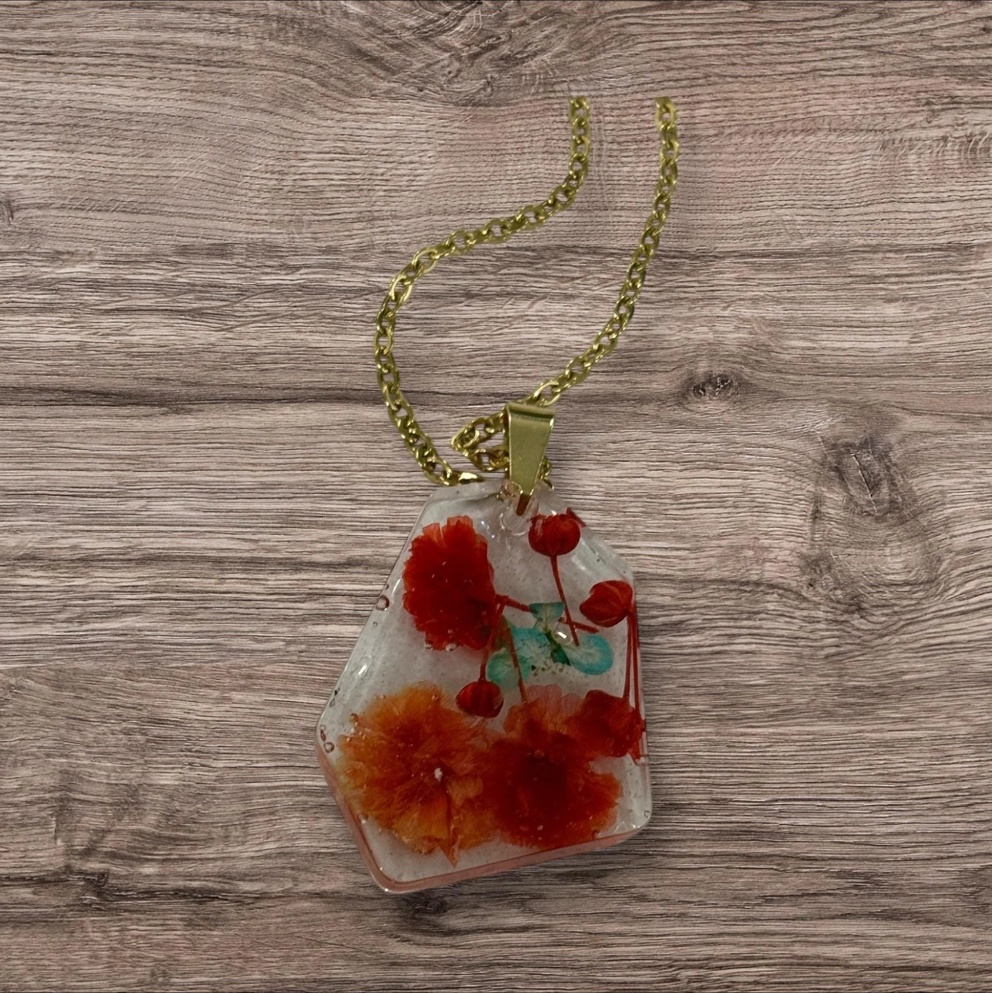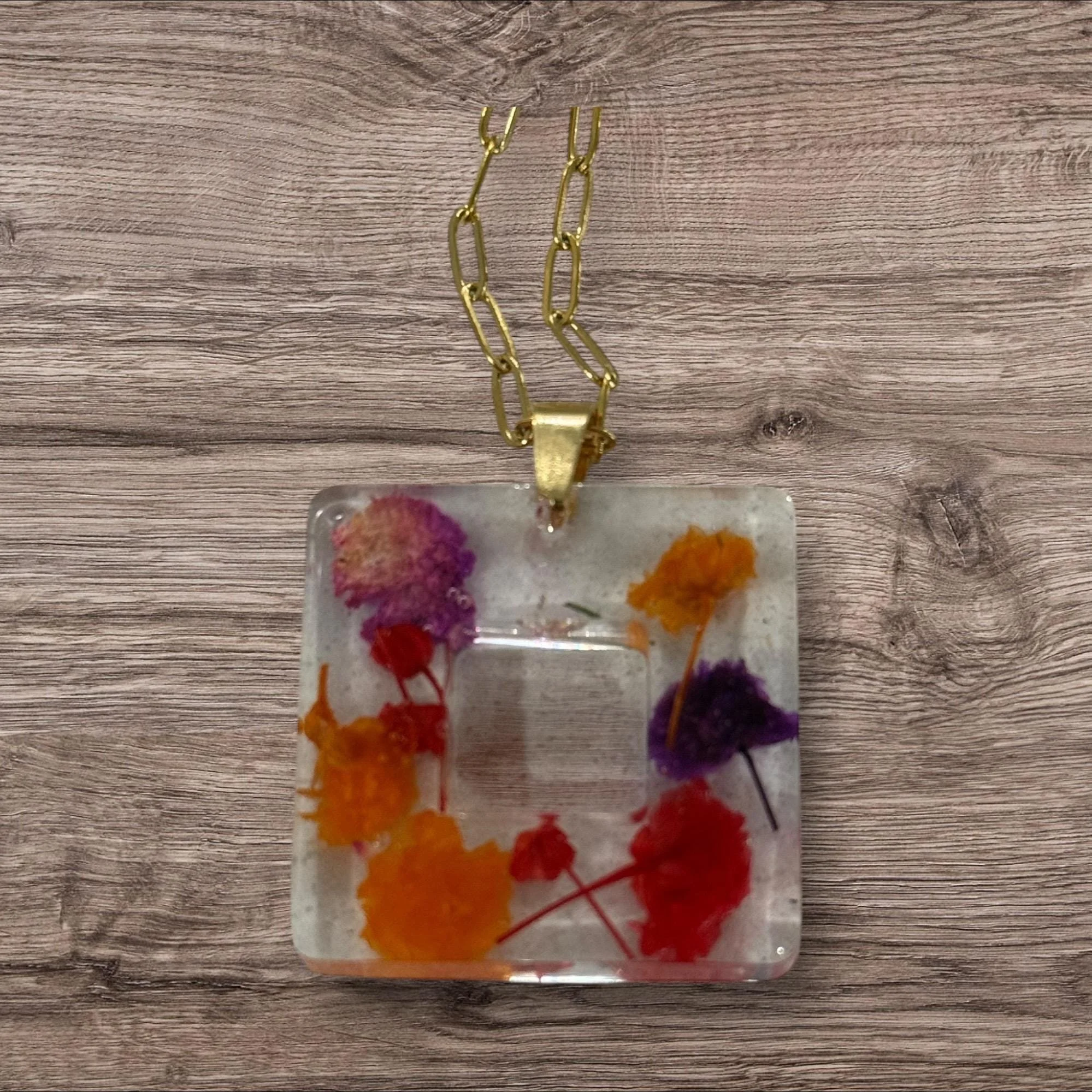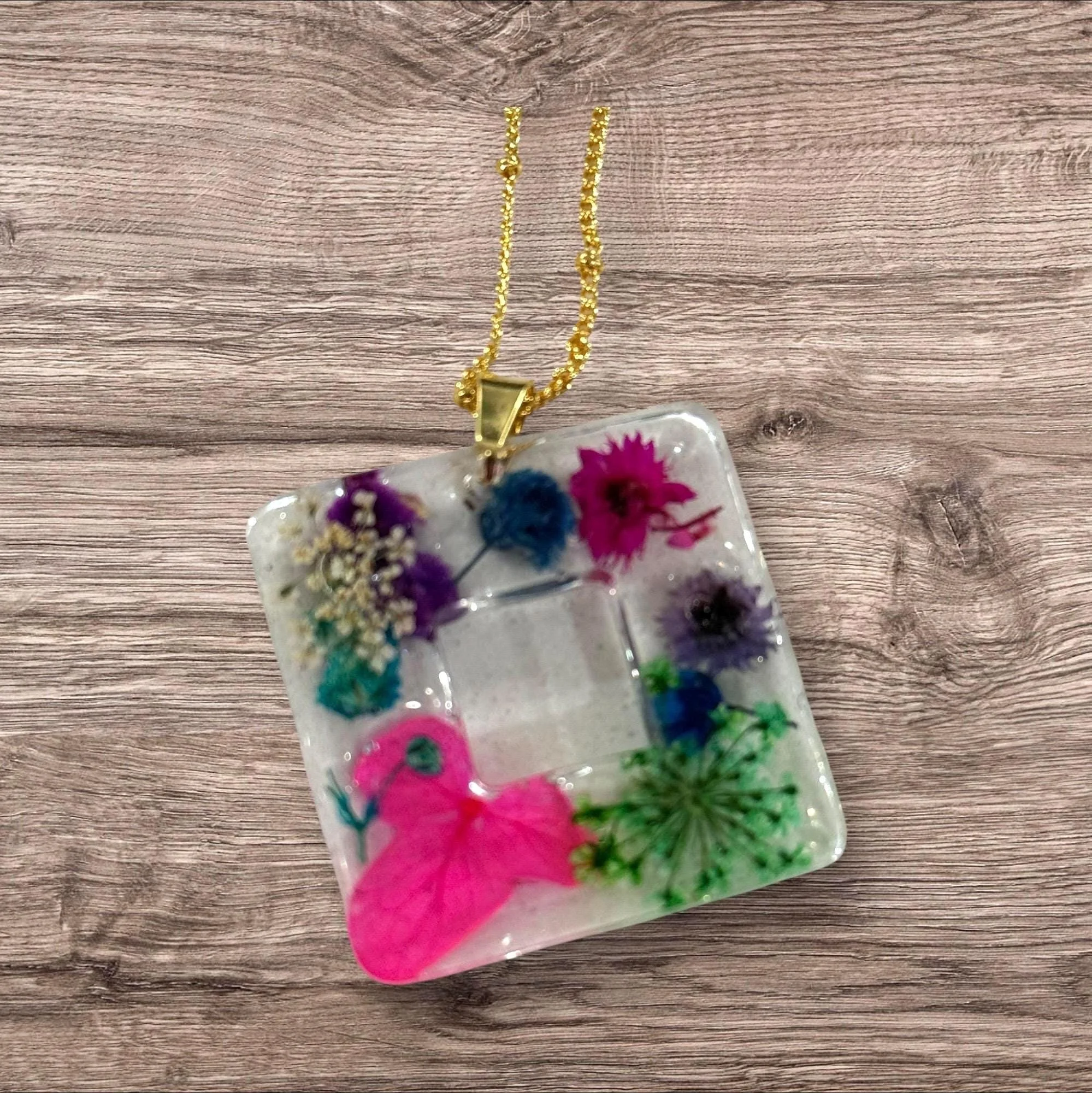 Handcrafted resin pendant with embedded real flowers